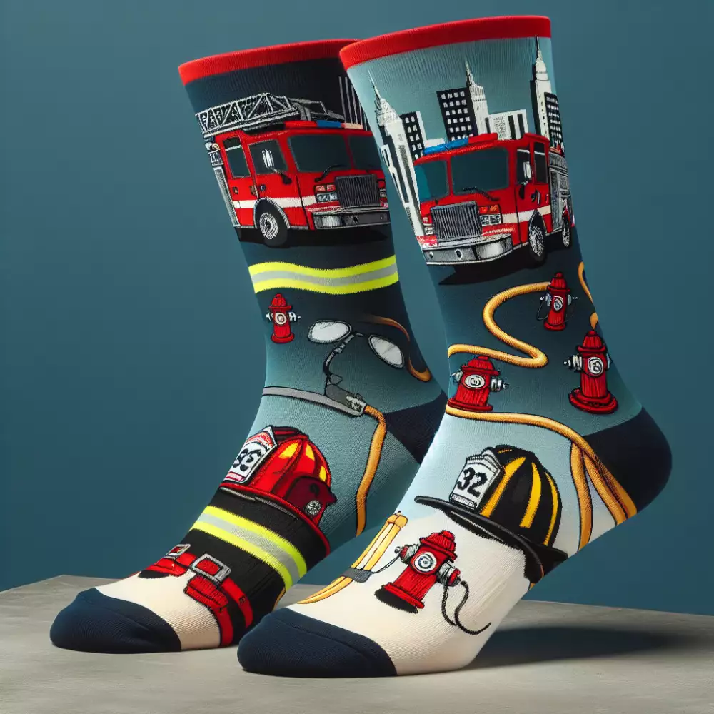 Tematické hasičské ponožky s motivem hasičů jsou oblíbeným doplňkem nejen mezi profesionálními a dobrovolnými hasiči, ale i mezi jejich příznivci. Tyto ponožky často zobrazují hasičské symboly jako žebříky, helmy, hadice nebo hasičská auta. Vyrábějí se v různých barevných kombinacích, přičemž dominují červená, modrá a černá barva. Materiálové složení těchto ponožek se může lišit, ale většinou obsahuje vysoký podíl bavlny pro zajištění pohodlí při celodenním nošení.